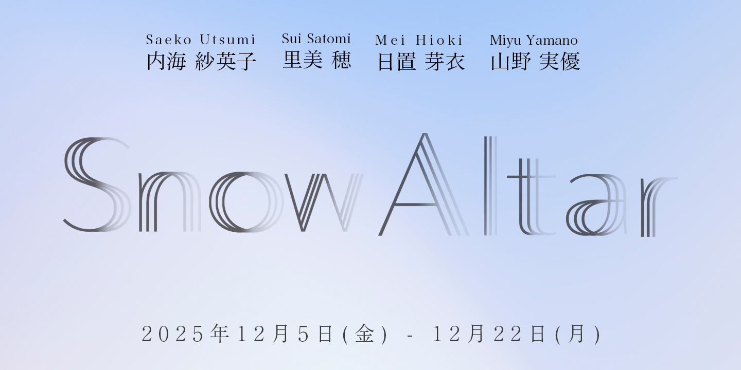 News 2025.12.06「line of silence」2026.01.09 - 2026.01.19 2025.11.06 「Snow Altar」 2025.12.5 - 2025.12.22 2025.10.06藤田つぐみ個展「わたくしごっこ ー 後編 ー」2025.11.7 - 2025.11.24 Exhibitions