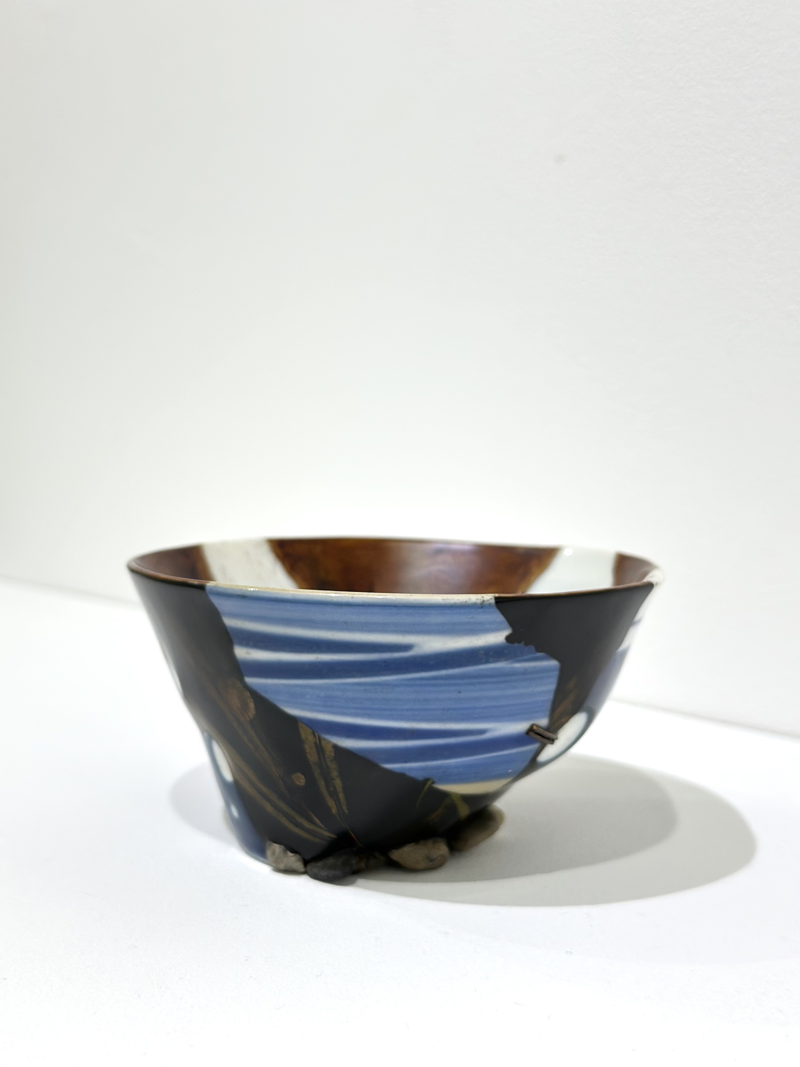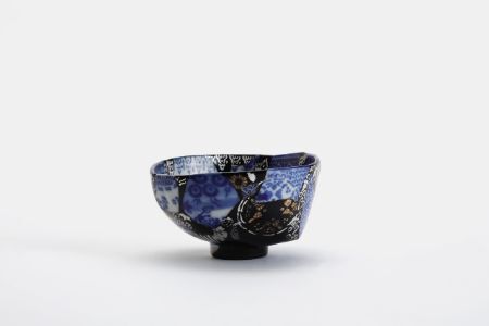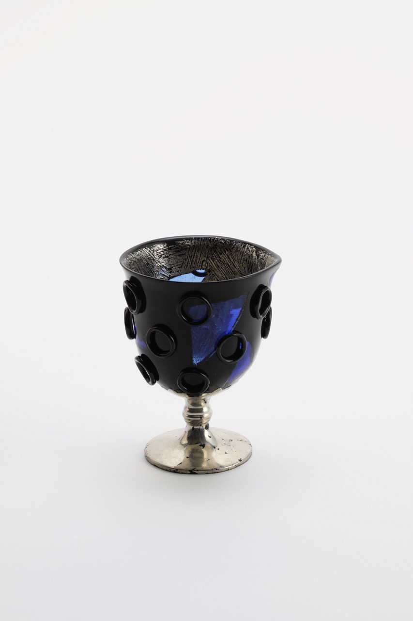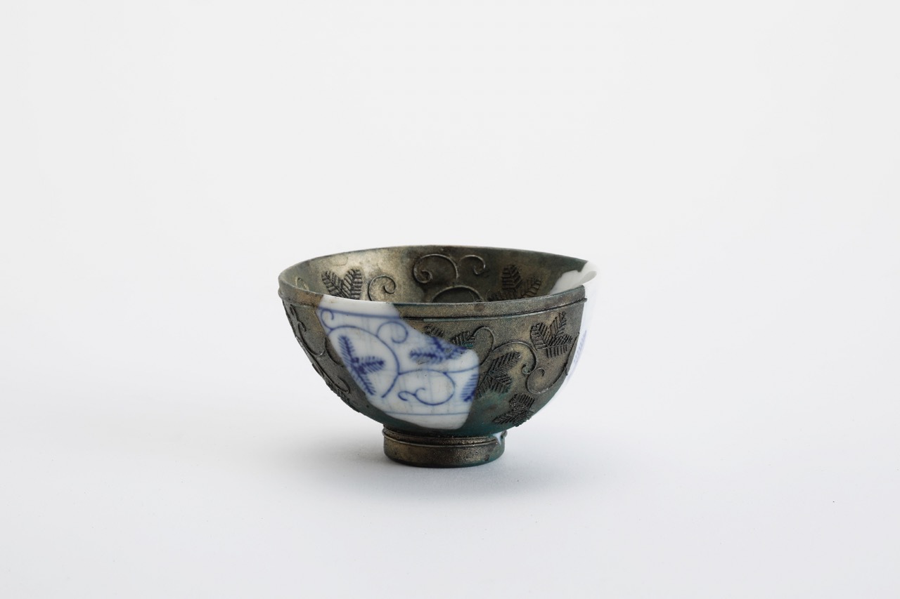 崇仁地区の高瀬川清掃に参加した際に、まとまった量の青いガラスの破片を拾うことができました。そのガラスの青さから、正倉院宝物である瑠璃坏を連想し、この作品を制作しました。高瀬川は江戸の初期に人工的につくられた川であり、瑠璃坏に準ずるものが落ちていることはありえないことですが、そもそも私たちが普段使っている器でさえ、そのルーツを辿ると悠久の昔に遡ることができるのではないかと思うのです。