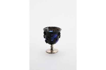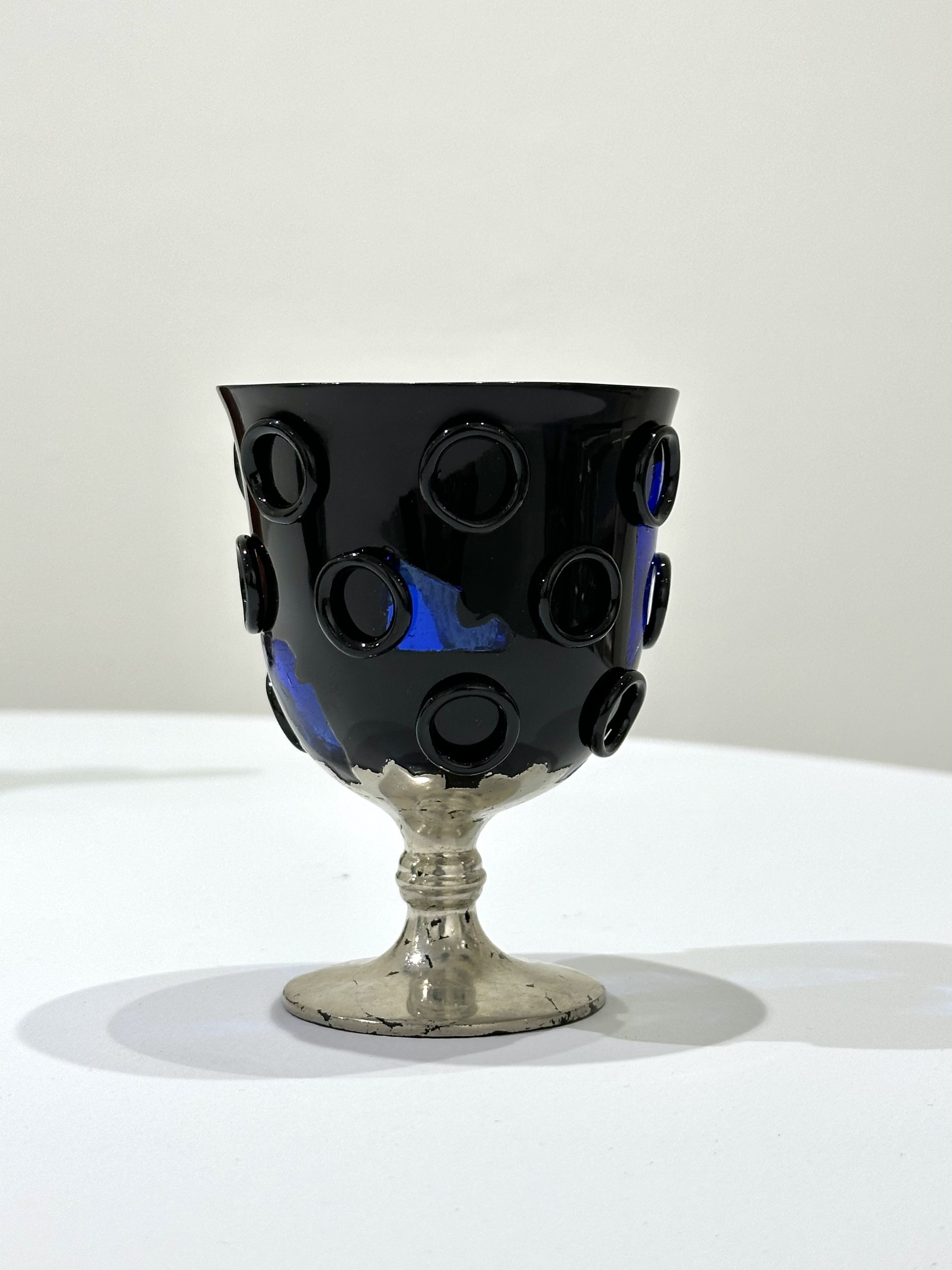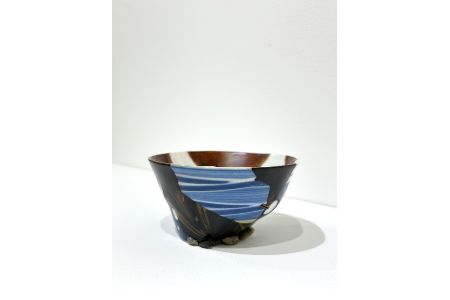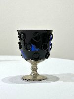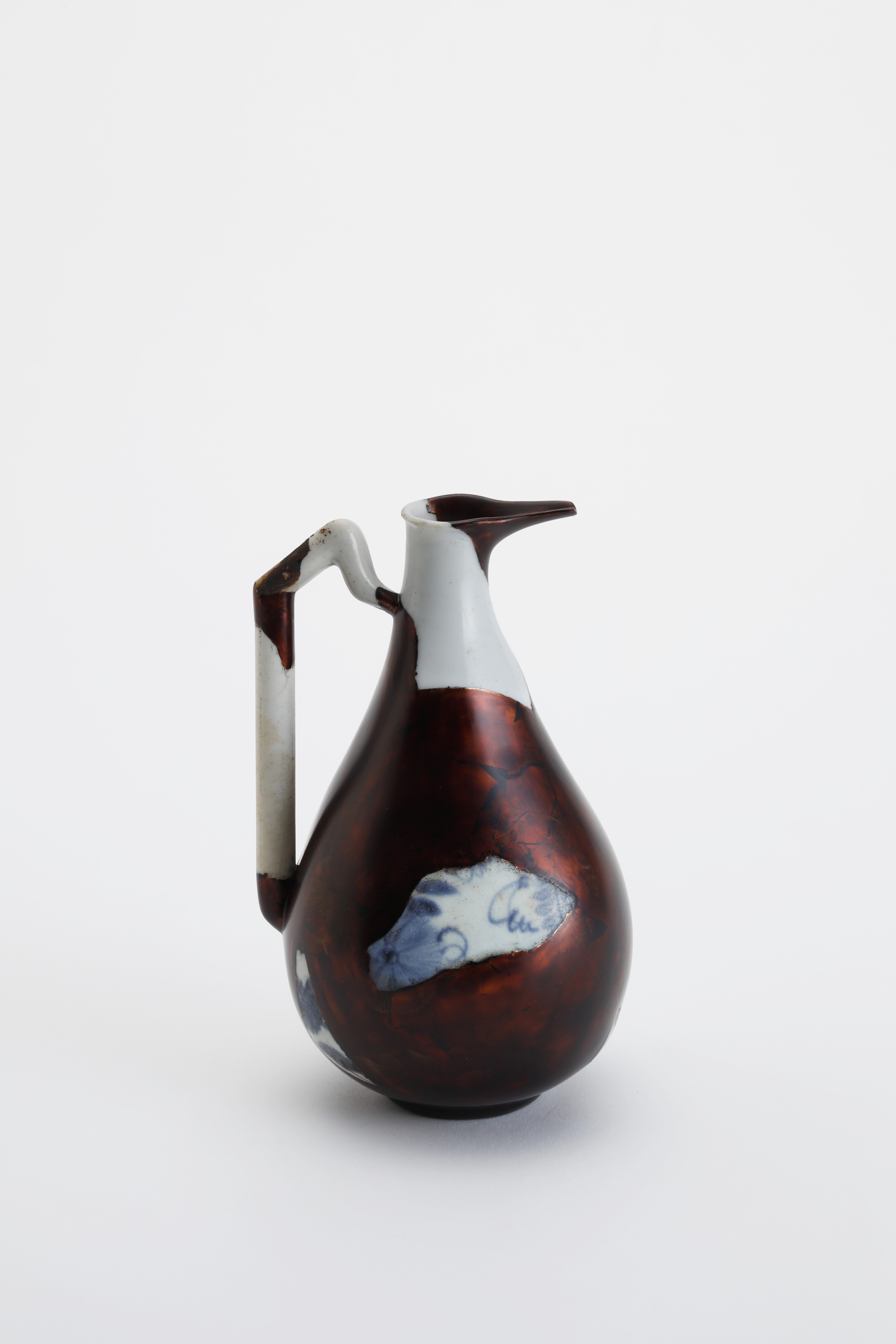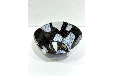 崇仁地区の高瀬川清掃に参加した際に、まとまった量の青いガラスの破片を拾うことができました。そのガラスの青さから、正倉院宝物である瑠璃坏を連想し、この作品を制作しました。高瀬川は江戸の初期に人工的につくられた川であり、瑠璃坏に準ずるものが落ちていることはありえないことですが、そもそも私たちが普段使っている器でさえ、そのルーツを辿ると悠久の昔に遡ることができるのではないかと思うのです。