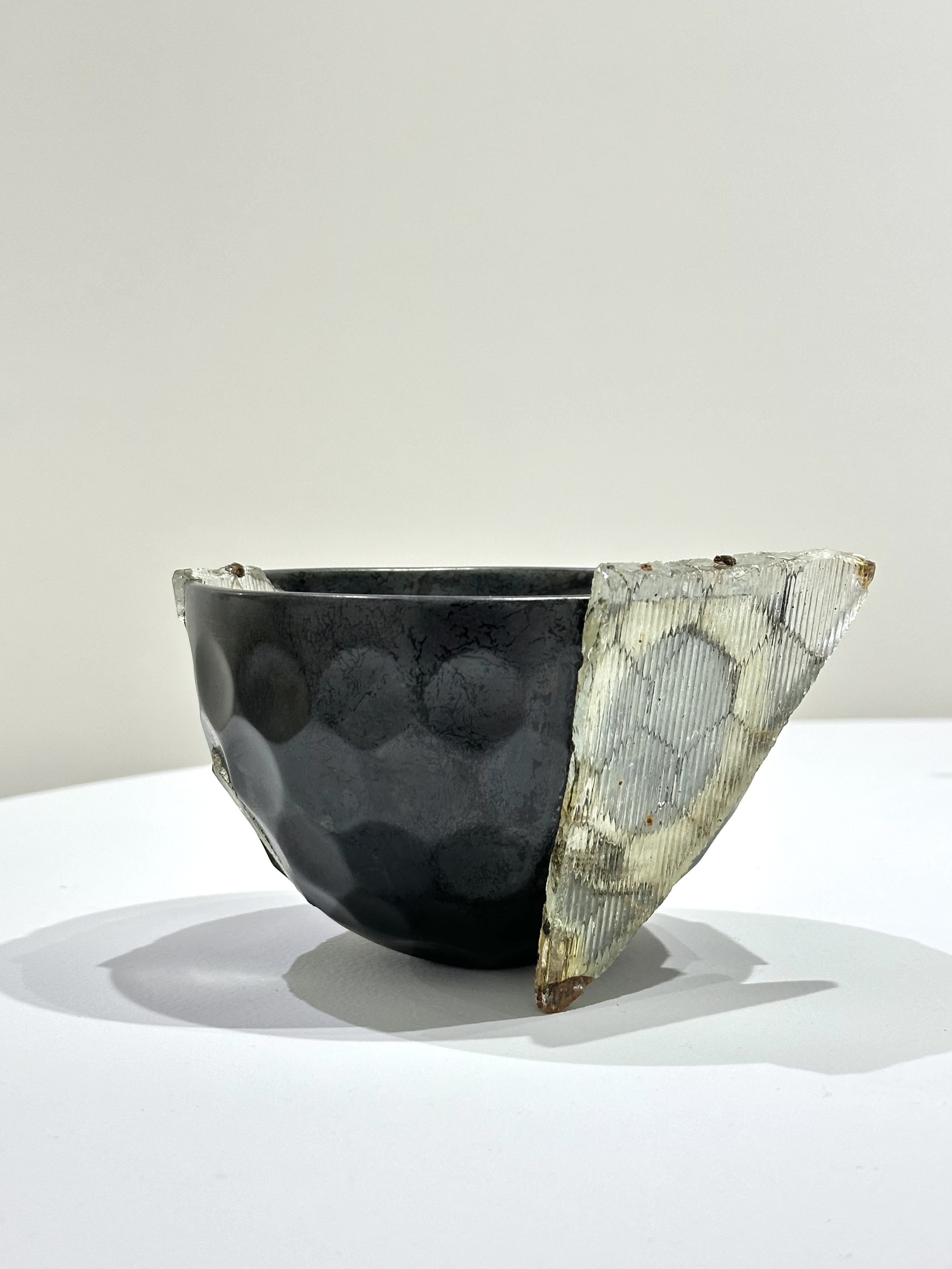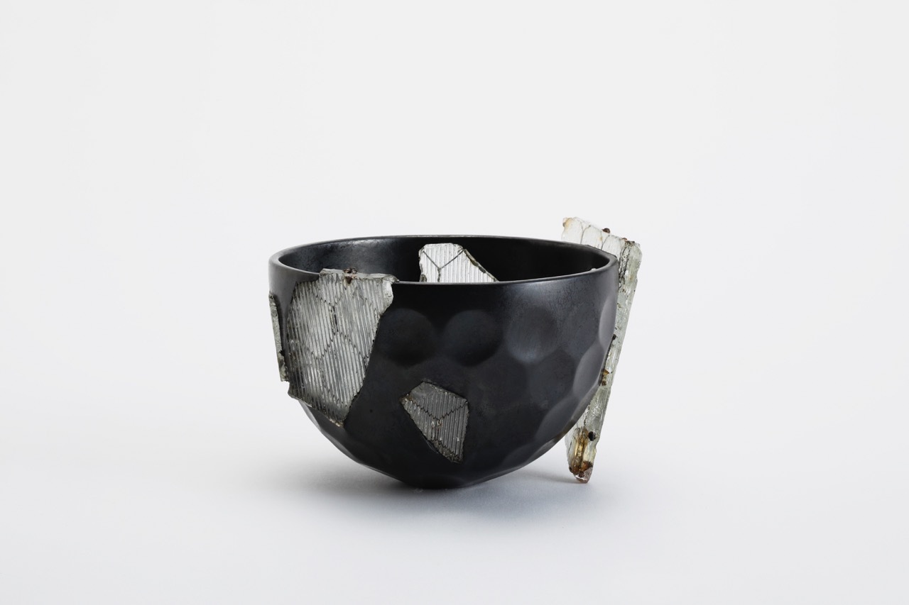 そのガラスの分厚さや鉄線の様子などから、少し古い倉庫や工場の窓ガラスだったのではと予想されます。ガラスに六角形の模様がついていることから、こちらも正倉院の白瑠璃碗を連想して制作しました。六角形の模様を繋げることを優先し、形は拾った板ガラスの形に手を加えることなく器の形に仕上げる為に、強引に組み合わせています。