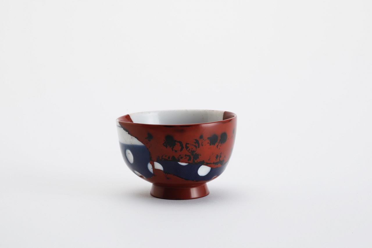 高瀬川からは印判転写で模様をつけた器の破片がよく見つかります。本作はその印判の模様を蒟醤技法で拡張したものです。蒟醤とはタイやミャンマーなどの代表的な技法で、模様を線彫りして色漆を埋め込み研ぎ出す技法です。印判の、主に線で構成された意匠が蒟醤の線彫の表現と合致すると考え制作しました。