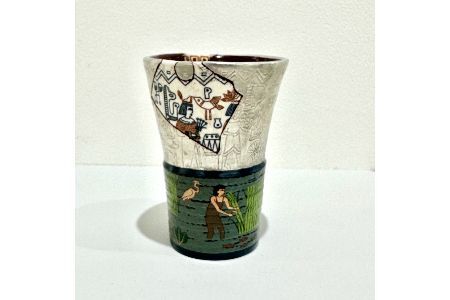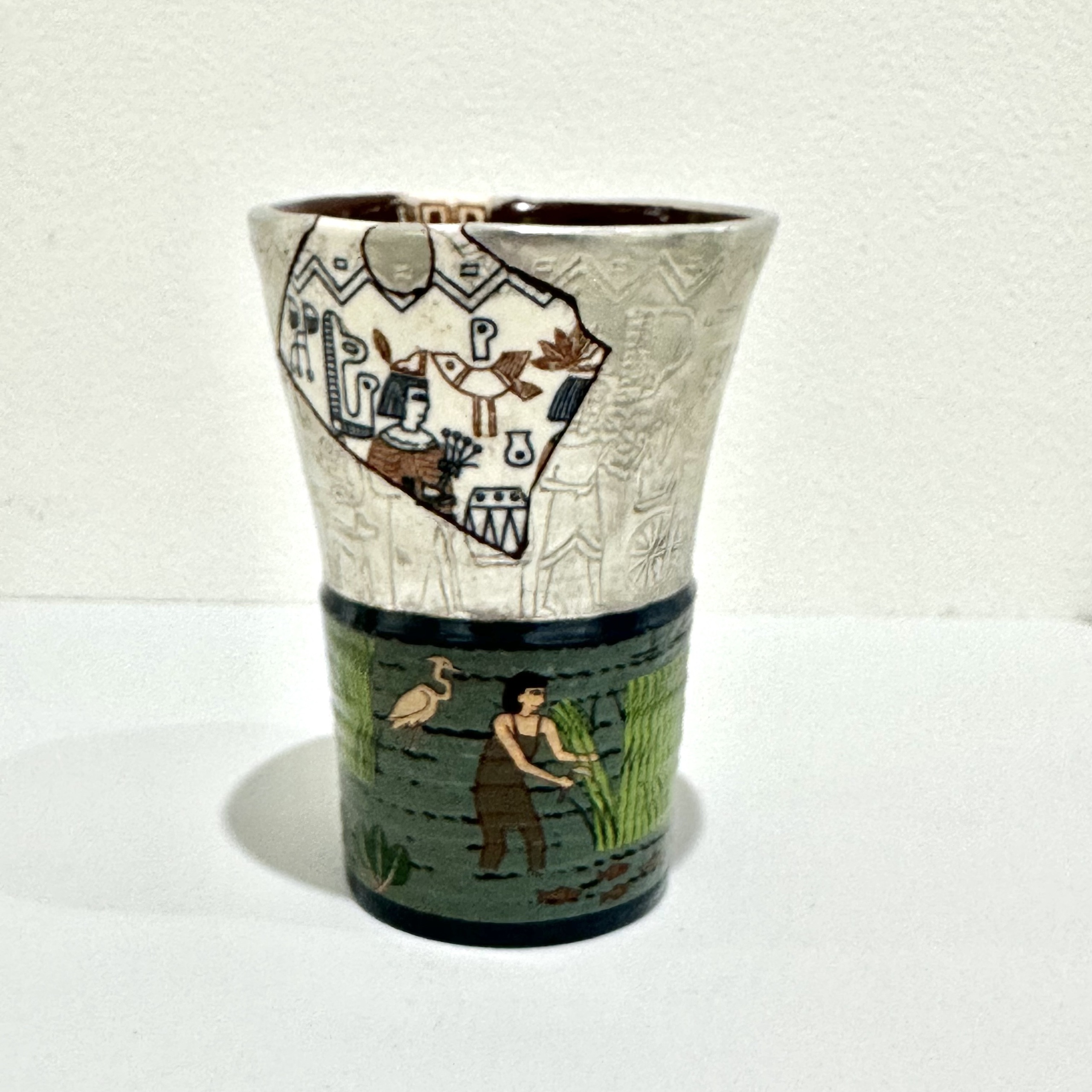エジプト壁画風の陶器片を拾ったことで、保勝会での活動や大学付近の様子をエジプト壁画風に表現しました。ナイル川を中心に栄えたエジプト文明のように、大学も高瀬川から豊かになっていくことを想像して制作しました。