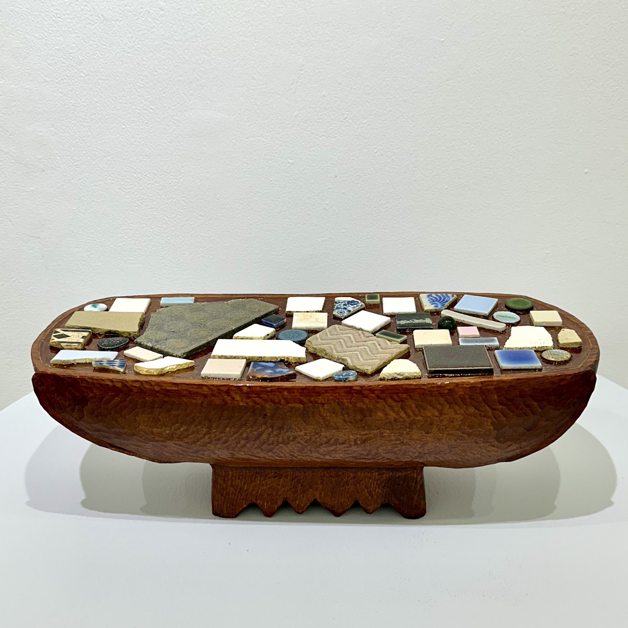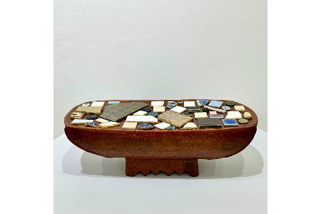 素材:漆、高瀬川の陶磁器片、高瀬川の石、卵殻、錫、砥の粉、フェルト