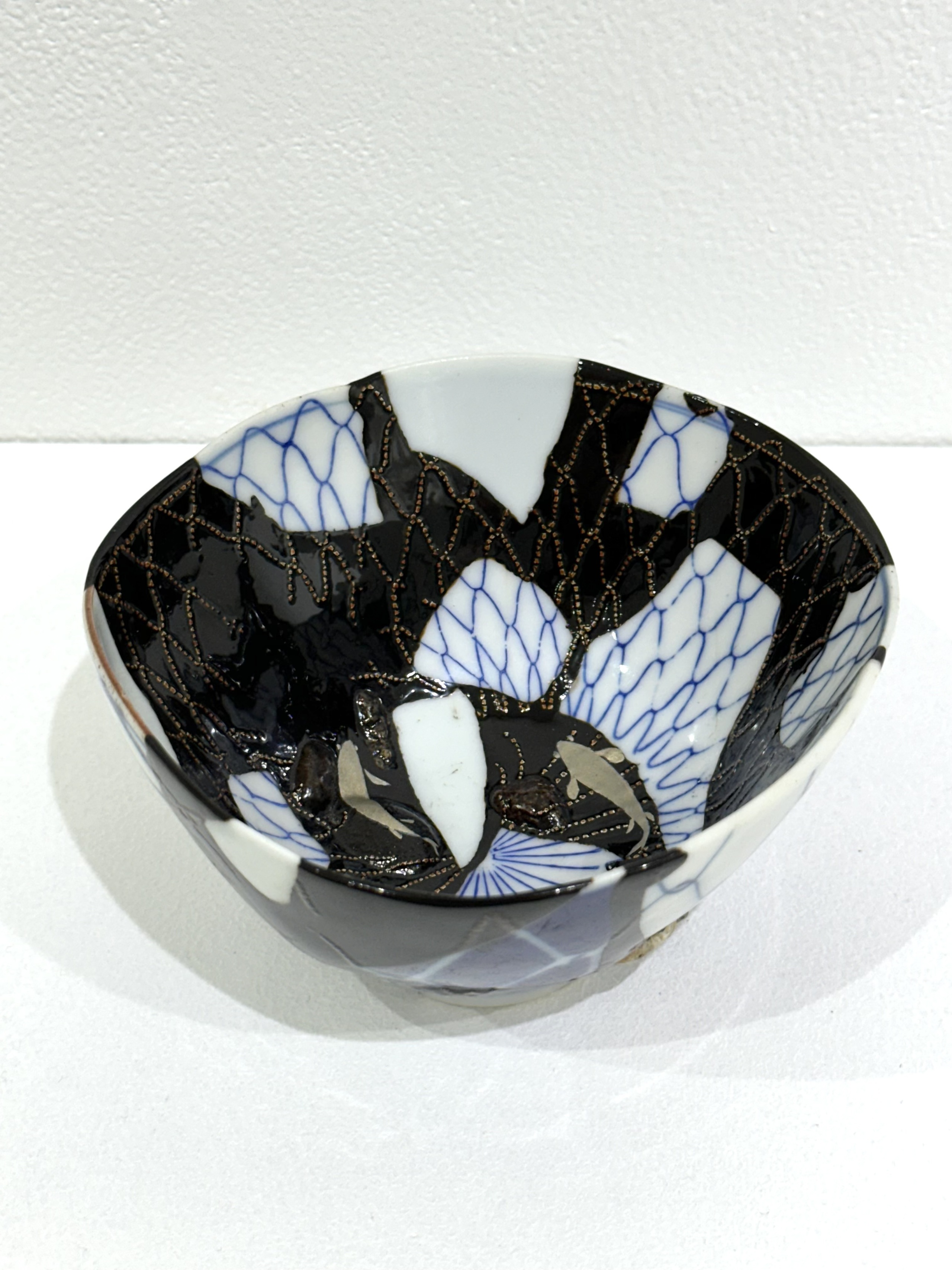 この作品には磁器片の他、高瀬川の底の小石も取り込んで制作しました。網を川底につけた時のようなイメージで、高瀬川とその周縁に生きる人々や魚などに景色が展開していく作品を目指しました。